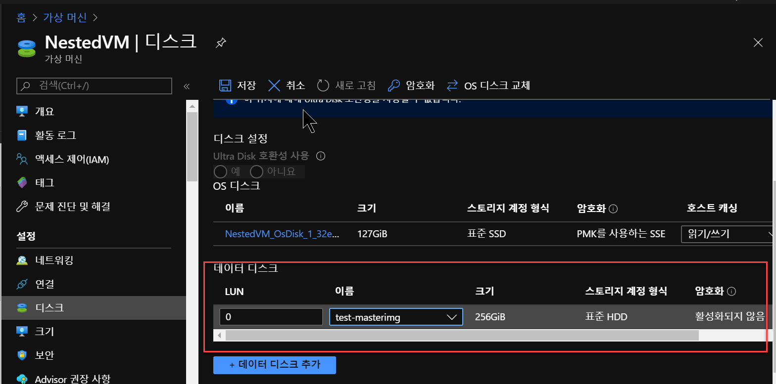 - 생성된 디스크를 Nested Hyper-V로 구성한 VM에 추가 합니다.