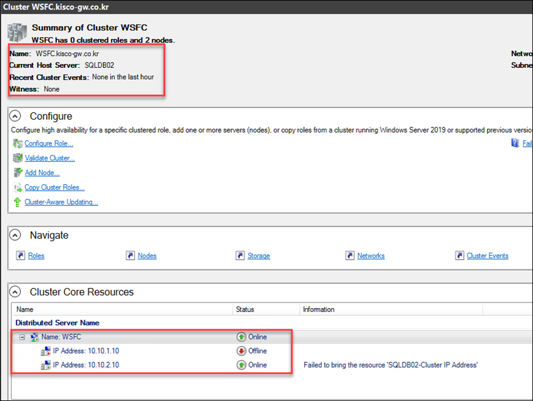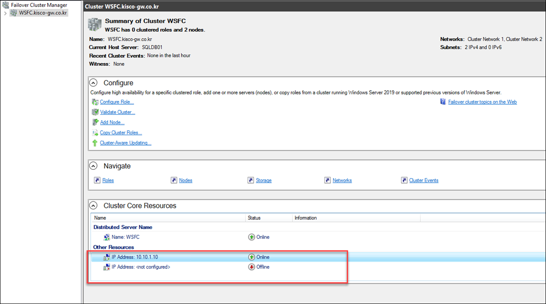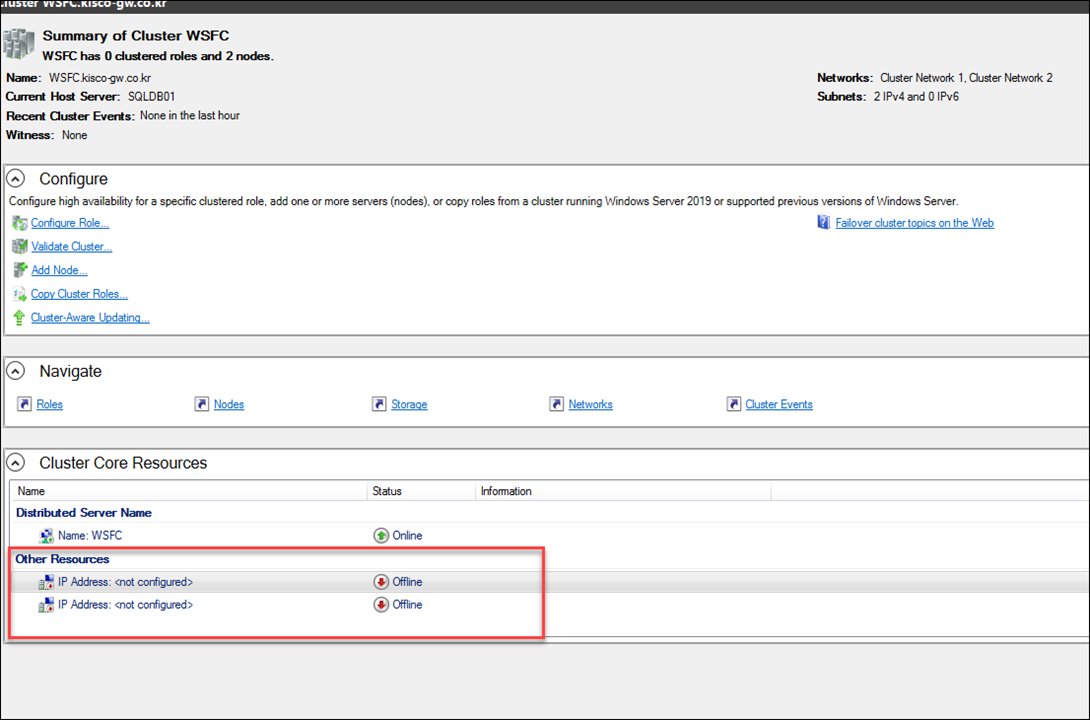 다음과 같이 Core Cluster의 IP가 오프라인으로 되어 있는지 확인하고 각 노드의 추가IP로 변경작업을 진행합니다.