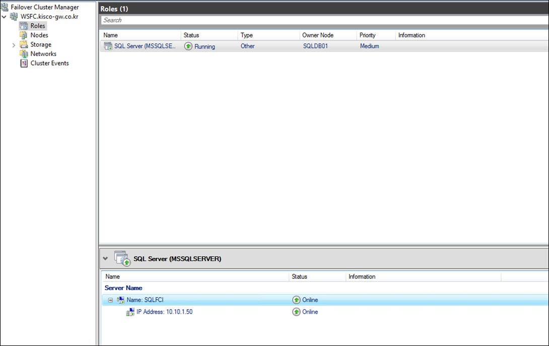 설치가 완료되면 하기와 같이 장애조치 클러스터 관리자에서 SQLFCI 리소스가 정상적으로 온라인 되었는지 확인합니다.