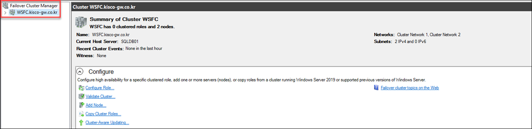 Windows 장애 조치 클러스터의 경우 Windows의 기능으로 구성되며 다음의 과정으로 진행합니다.
