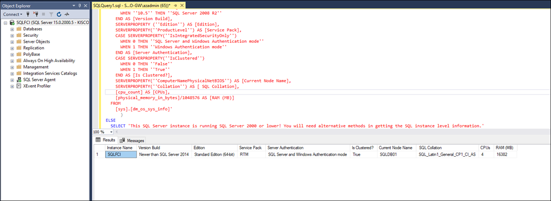 SELECT 'This SQL Server instance is running SQL Server 2000 or lower! You will need alternative methods in getting the SQL instance level information.'