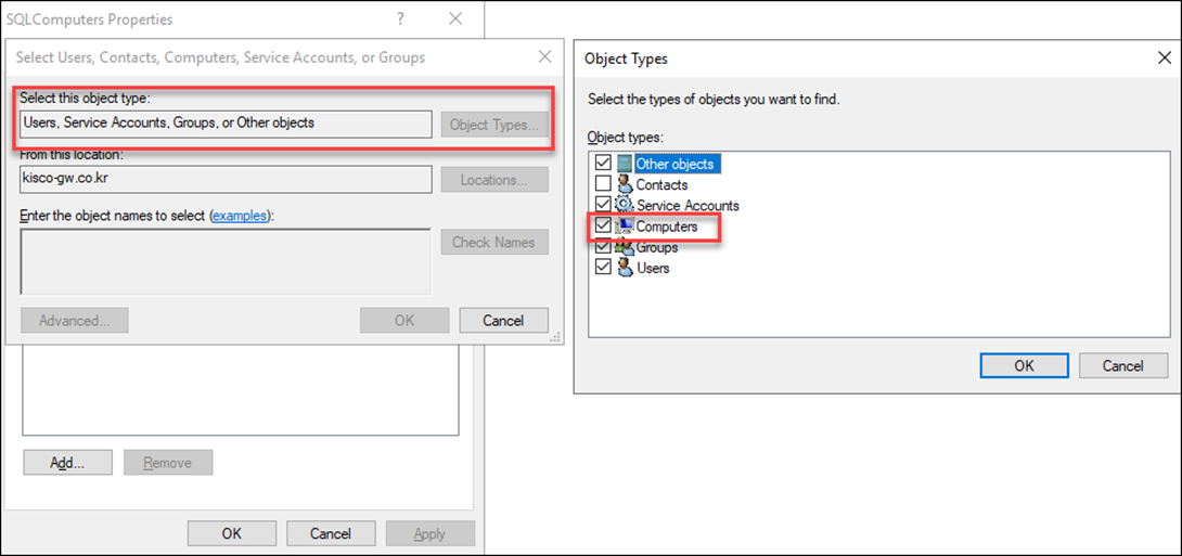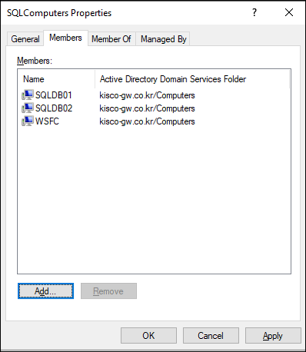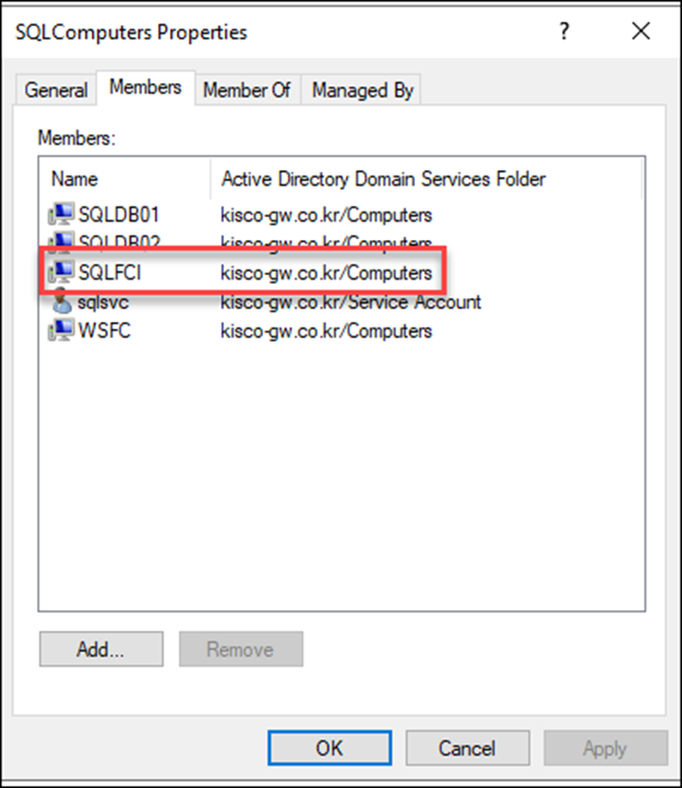 추가적인 권한 할당을 위해 SQLComputers그룹의 구성원에 SQLFCI Computers 개체를 추가합니다.