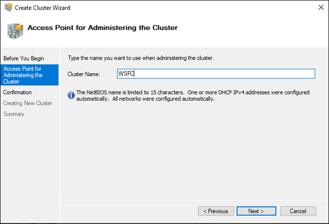 마법사에서 WSFC 클러스터의 이름을 입력합니다. 본 가이드에서는 “WSFC”로 입력합니다.