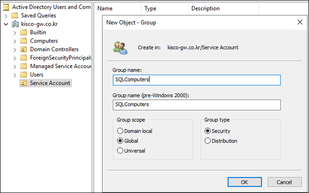 [쿼럼 및 SQL 클러스터 리소스 생성을 위한 AD 그룹 생성 및 권한 위임 작업]