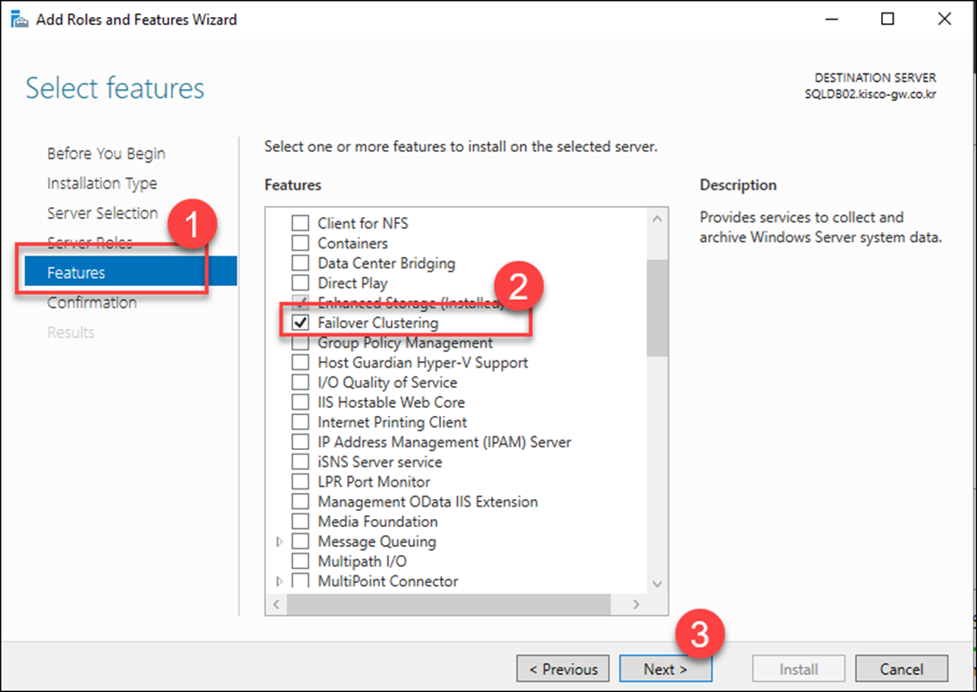 기능(Features)->장애조치 클러스터(Failover Clustering) 설치