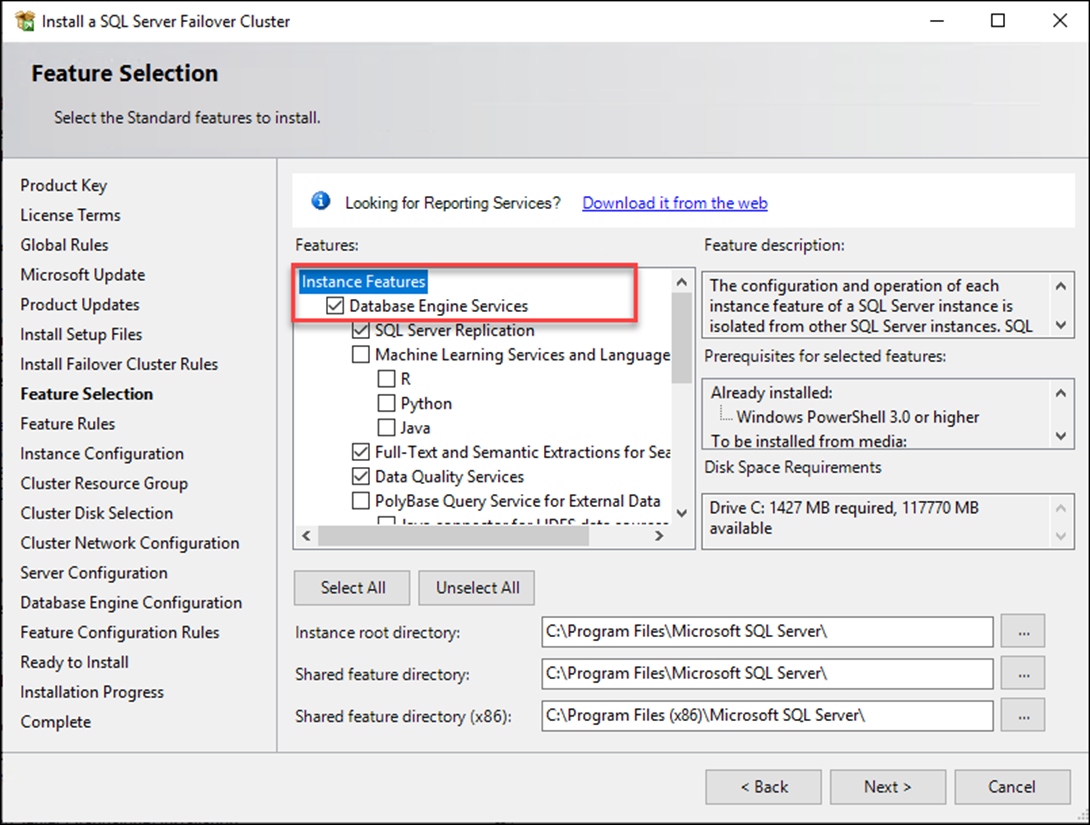 본 테스트는 SQL 데이터베이스 엔진 기능에 대한 클러스터 구성이므로 데이터베이스 엔진 서비스만 선택하여 구성합니다.