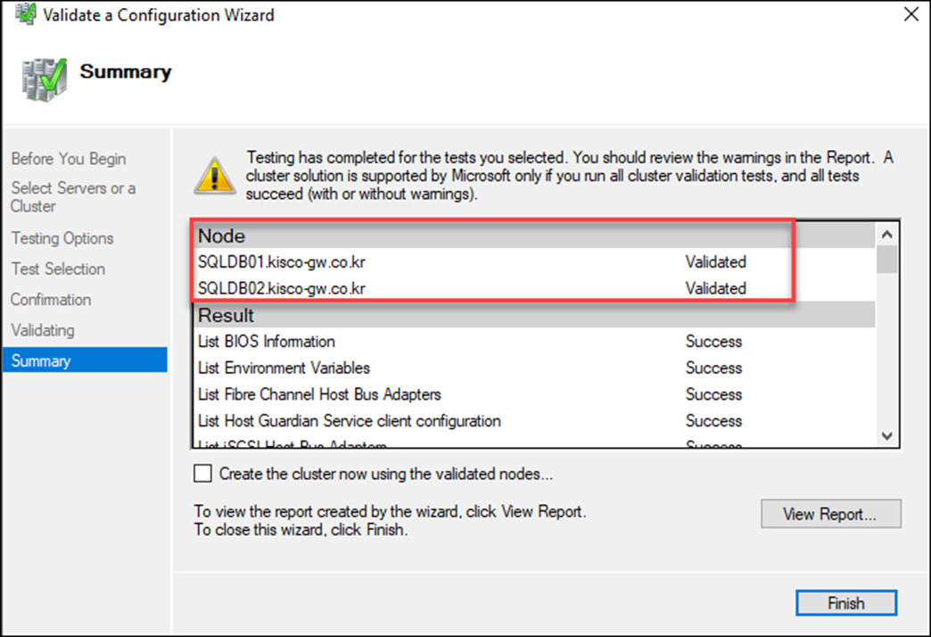 양 노드의 결과가 Validated로 나오는지 확인합니다. AWS같은 환경의 경우 DHCP를 사용하므로 네트워크 관련된 경고가 나타날 수 있으며, 이는 환경의 문제이므로 무시해도 관계없습니다. 단, 경고가 아닌 오류가 발생된 경우 클러스터를 생성한 뒤 Microsoft의 기술지원을 받을 수 없습니다. 해당 리포트는 클러스터 로그의 경로에 함께 xml파일 형태로 저장됩니다.