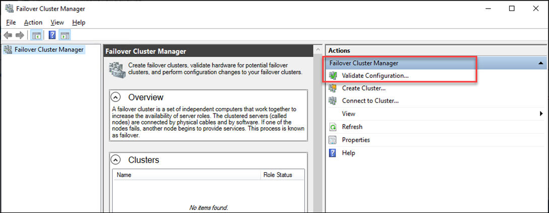 관리 도구->장애조치 클러스터 관리자->클러스터 유효성 검사(Validate Configuration)를 실행합니다.