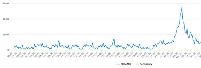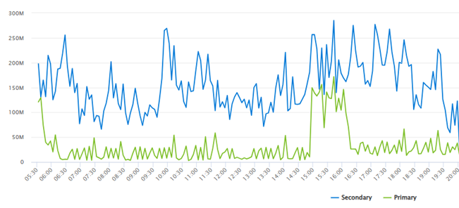 -ER 서킷의 Primary 및 Secondary 연결을 In/Out 트래픽을 확인해 보면 아래와 같이 In의 경우 양쪽에서 온프렘으로부터 트래픽이 확인이 되지만 Out 의 경우 Azure 에서 Primary 로 나가는 것만 확인이 되었습니다.