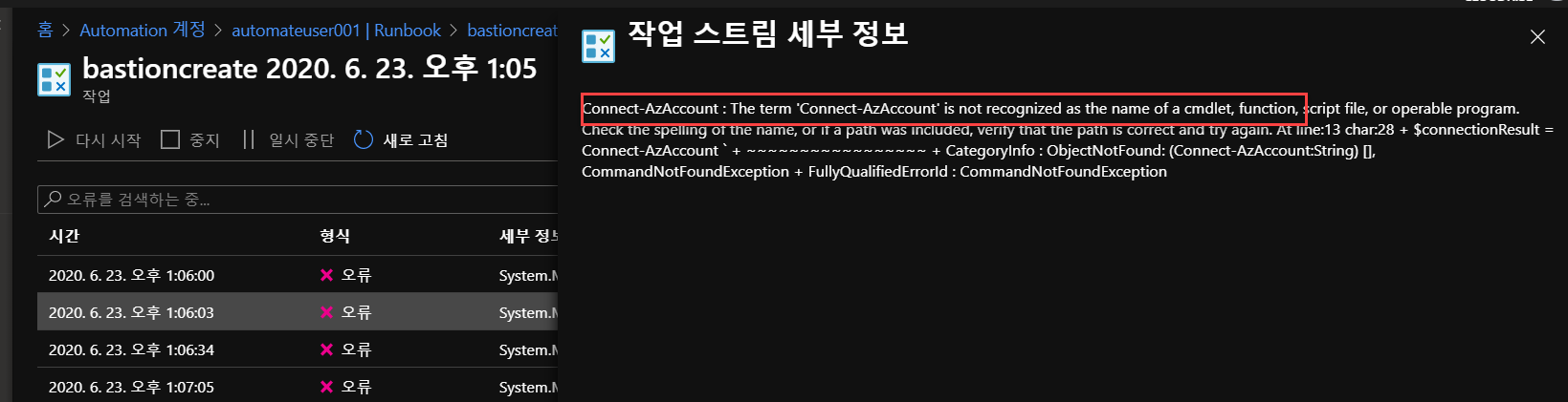 방법은 automation->module에서 az.account를 추가하고 이후 종속성 모듈을 추가 합니다.